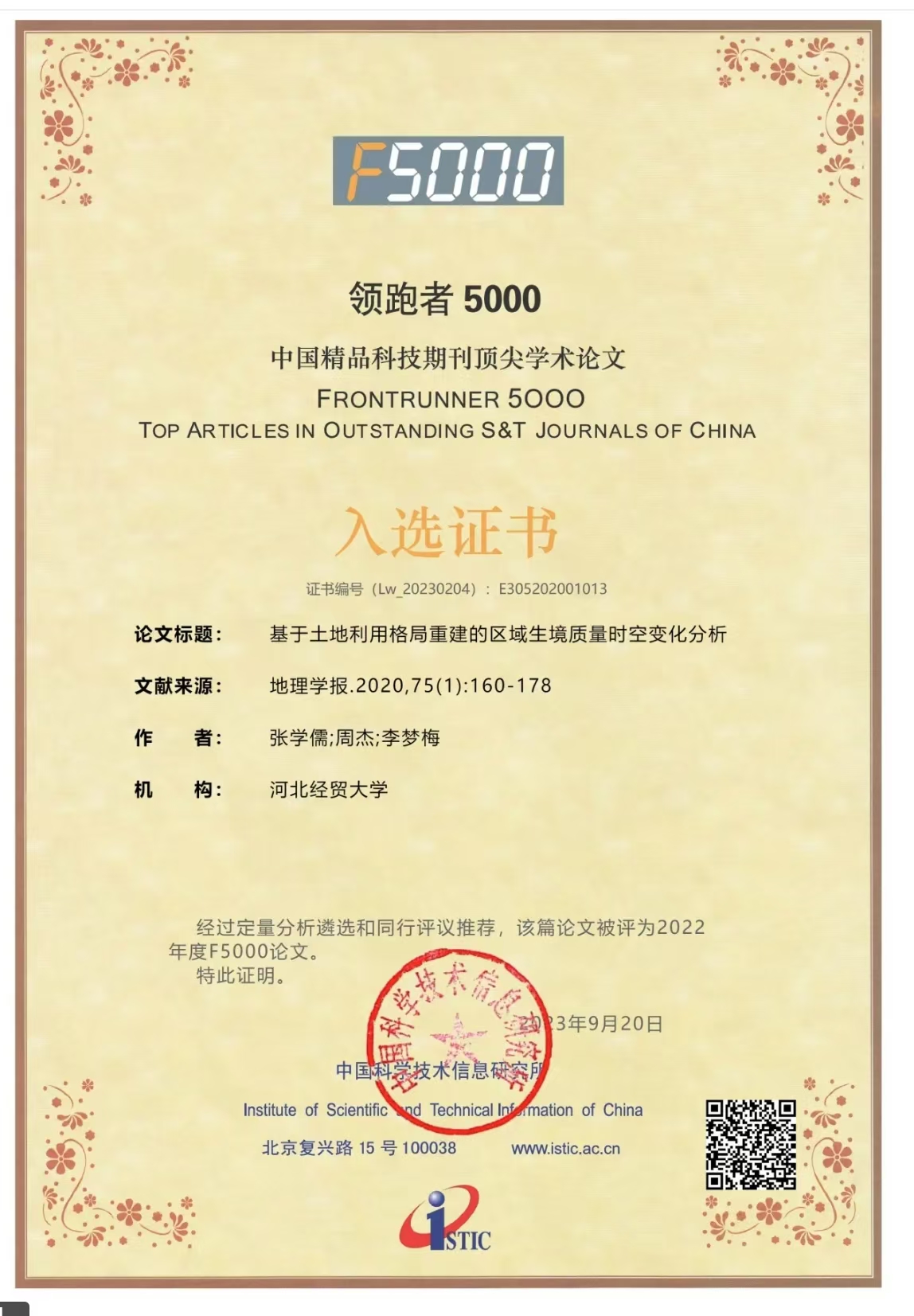“领跑者5000——中国精品科技期刊顶尖学术论文”项目(F5000项目)由中国科学技术信息研究所创办,是为了进一步推动我国科技期刊的发展,提高其整体水平,更好地宣传和利用我国的优秀学术成果,起到引领和示范的作用,根据定量分析数据和同行评议结果,在中国精品科技期刊中遴选优秀学术论文,并集中对外展示和交流我国的优秀学术论文。
