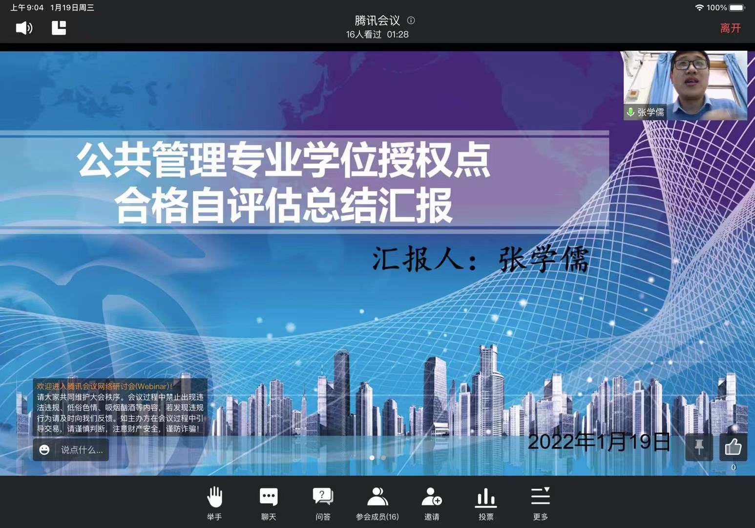 2022年1月19日上午,best365体育亚洲于线上召开了“公共管理专业学位授权点合格评估专家论证会”。评审专家组由全国公共管理硕士(MPA)专业学位教育指导委员会委员、北京航空航天大学郑晓齐教授、首都经济贸易大学麻宝斌教授、南开大学孙涛教授、北京师范大学章文光教授、中央民族大学李俊清教授五位专家组成。best365体育亚洲经理赵建强、副经理张学儒以及学位点部分骨干教师出席了本次论证会。评审专家组组长郑晓齐主持会议。