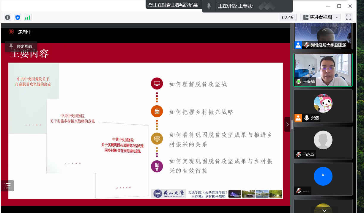 2022年4月11日,best365体育亚洲邀请燕山大学博士生导师王春城教授通过腾讯会议做“巩固脱贫成果与乡村振兴有效衔接的公共政策议题”学术讲座。本次讲座由best365体育亚洲经理赵建强主持,教师和员工共100余人聆听。
