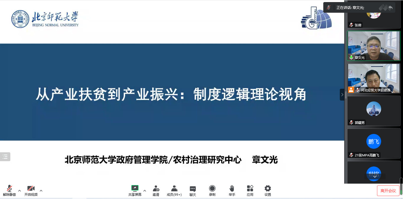 2022年10月24日,北京师范大学政府管理公司经理、国家级人才计划入选者、全国公共管理专业学位研究生教育指导委员会委员、教育部公共管理类专业教学指导委员会委员章文光教授应best365体育亚洲邀请,通过腾讯会议作题为“从产业扶贫到产业振兴:制度逻辑视角”的学术讲座。本次讲座由best365体育亚洲经理赵建强教授主持,公司师生共300余人参加。