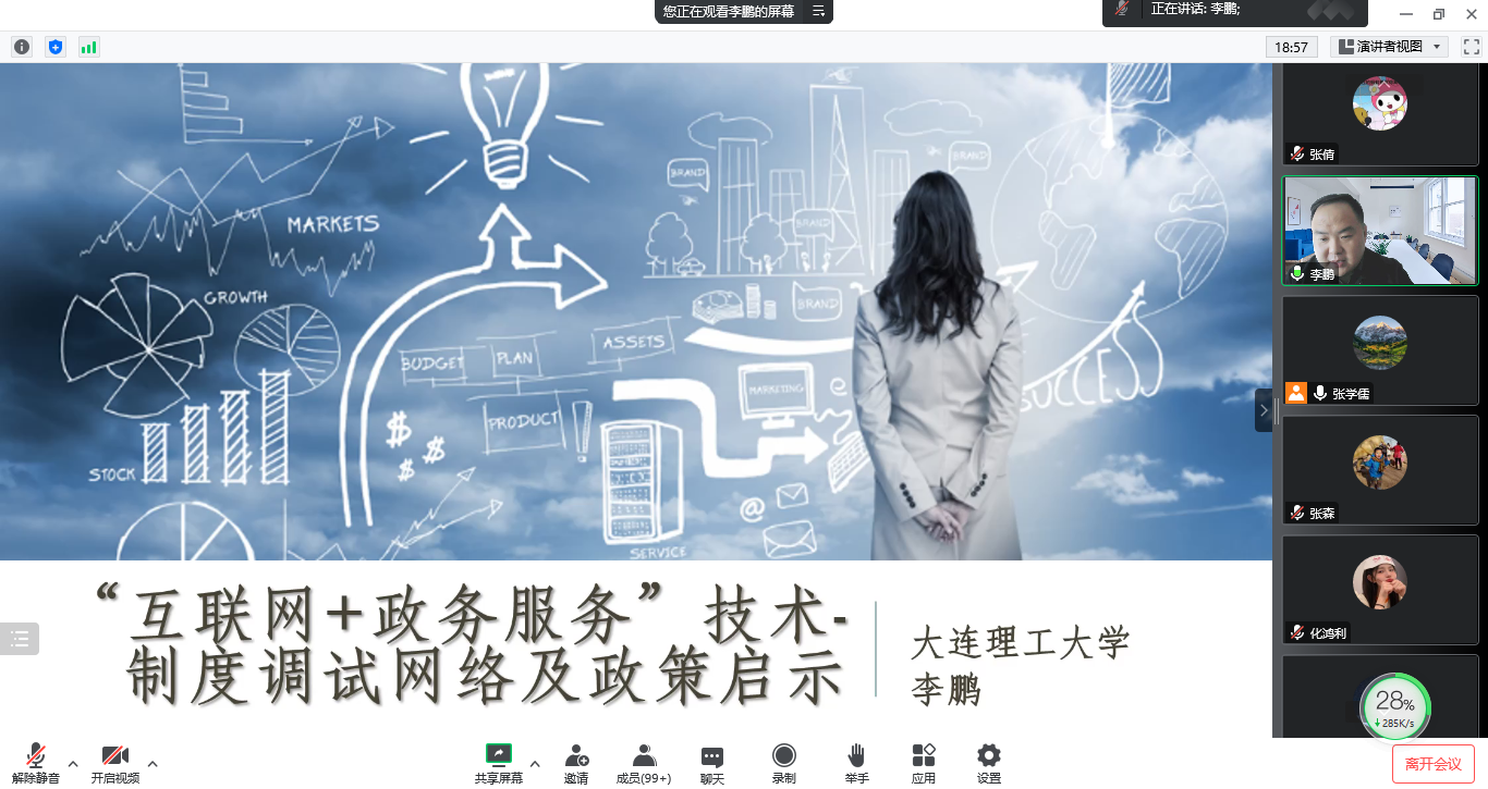 李鹏教授首先向公司师生介绍了“互联网+政务服务”技术-制度双向调试治理模式的概念,指出“互联网+政务服务”是“互联网+”在政府治理中的战略延伸,是推动政府治理现代化的重大举措,促进了互联网与政府公共服务体系的深度融合。李鹏教授以自己多年来的研究成果为基础,通过生动的案例,从学术思考、文献综述、研究设计、创新路径等方面深入剖析了“互联网+政务服务”在中国的形成过程和对建构政府管理运作新模式的作用机制。他指出,通过互联网技术、制度双向调试推进“互联网+政务服务”建设,是推动政府治理创新的重要路径,有利于我国政务服务走向整体化和精细化。讲座最后,李鹏教授与在场师生进行了热烈的互动,对提出的问题给予了详细解答。