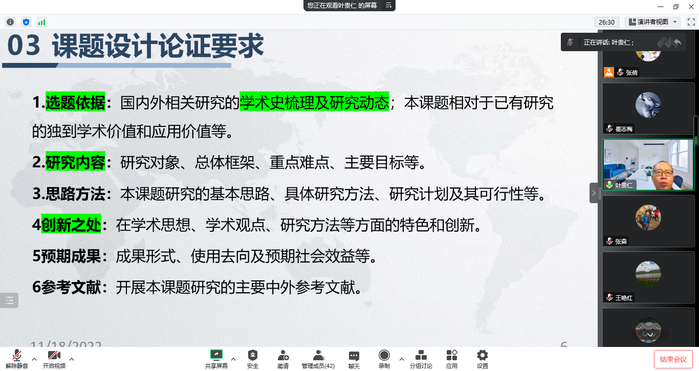2022年11月18日晚,best365体育亚洲邀请华南理工大学best365体育亚洲博士生导师叶贵仁教授作题为“国家社科基金申报的体会与经验”的线上学术讲座。